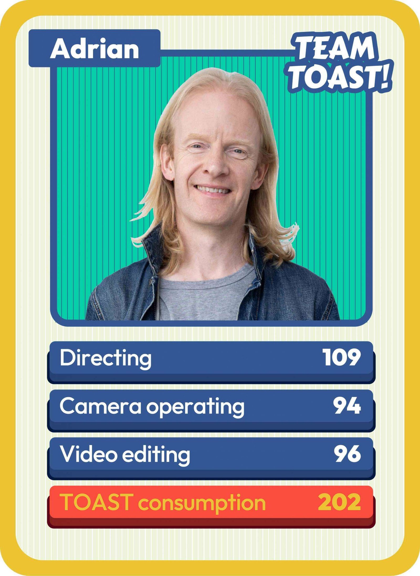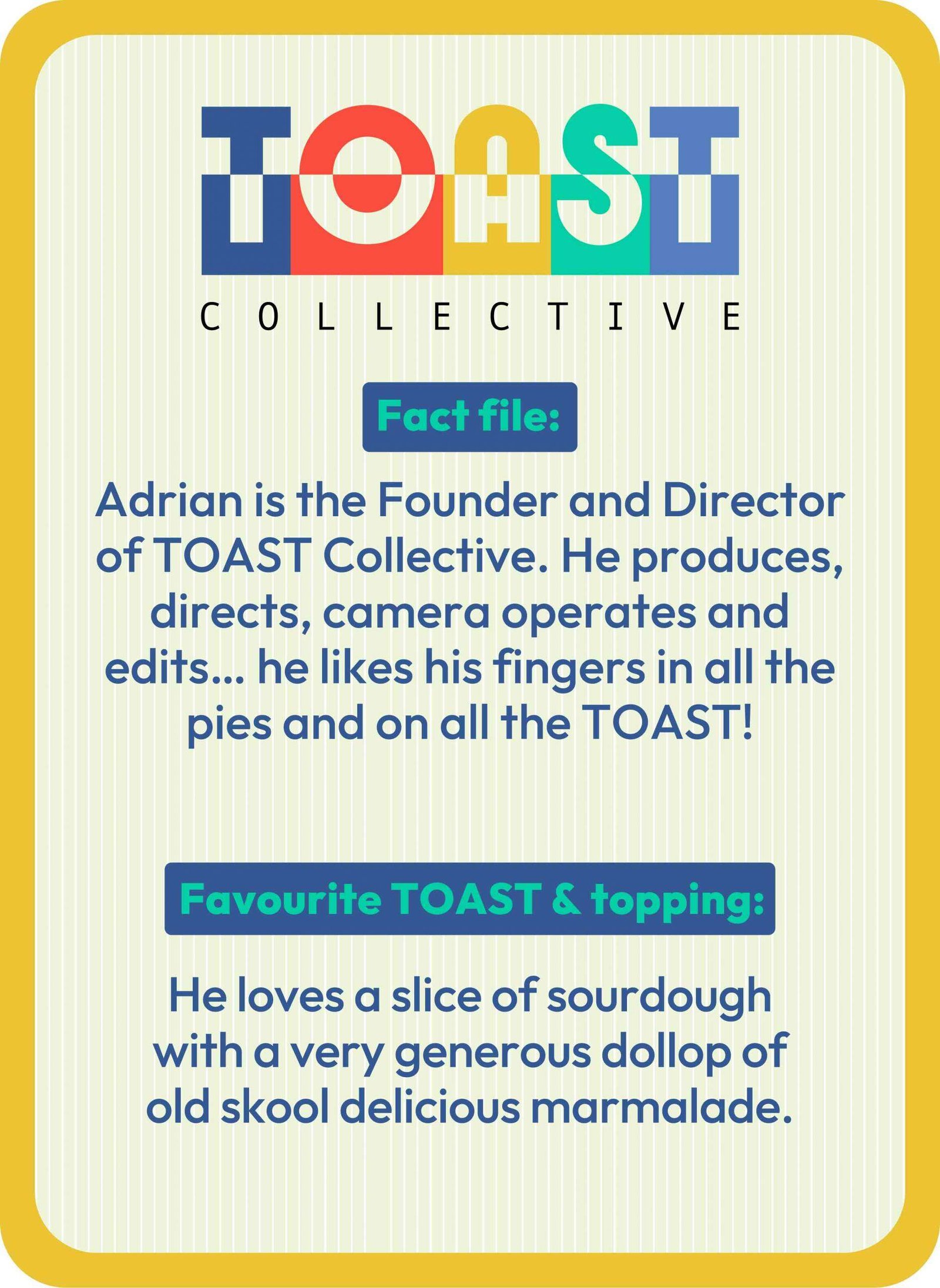 “Having worked with Adrian on numerous occasions, he’s always a pleasure to work with throughout the whole filmmaking process. He knows his technical stuff, and he knows how to build strong relationships with the client. Any crew Adrian brings in are always equally as skilled, experienced and professional as he is. I would highly recommend Adrian and team TOAST !”